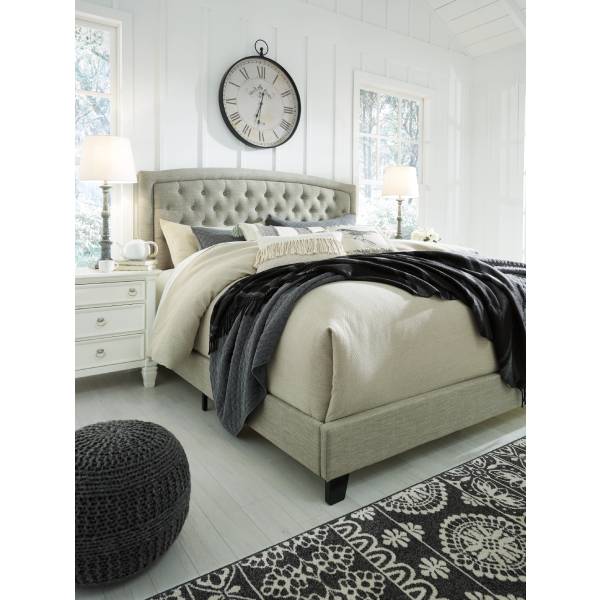 With its neutral tone and understated elegance, the Jarlee Queen Upholstered Panel Bed effortlessly fits into a variety of bedroom styles, from contemporary to traditional. It requires a foundation or box spring for mattress support, sold separately. Both mattress and foundation are available at Teletime. Assembly is required, with an estimated time of 10 minutes. Create a tranquil retreat with this beautifully crafted upholstered bed, combining style, comfort, and practicality for a restful night's sleep.
