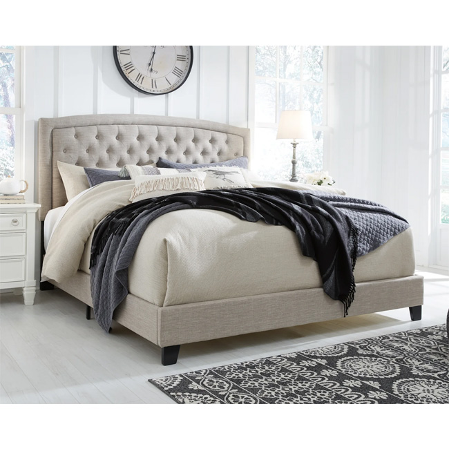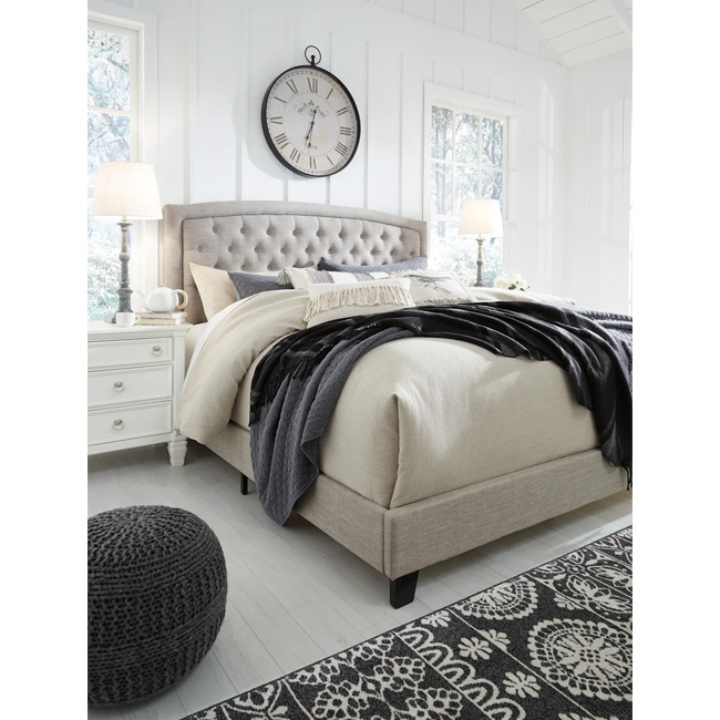 Create a serene and stylish bedroom escape with the Jerary king upholstered bed, combining luxury and value. The light gray fabric on the arched, button-tufted headboard adds a touch of elegance, with its textured weave offering a modern, fresh appeal. The footboard and rails, wrapped in cool gray upholstery, complete the cohesive and calming look. With dark brown wooden feet for added sophistication, this bed brings both comfort and style to your space. The bed requires a foundation or box spring and is also compatible with adjustable bases, offering flexibility to meet your comfort needs. Easy to assemble, the Jerary bed is designed to enhance your bedroom with effortless charm.