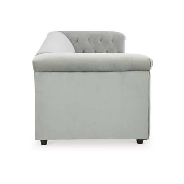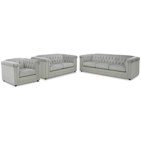 The Josanna Sofa, Loveseat, and Chair set showcases a timeless Chesterfield-inspired design that seamlessly blends classic elegance with modern appeal. Upholstered in a luxurious silvery gray velvet fabric, this collection not only looks stunning but also feels exceptionally soft to the touch. Signature design elements such as deep button tufting, high shelter arms, and pewter-tone nailhead trim add sophistication and charm, while the hidden leg design gives it a contemporary edge.