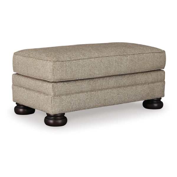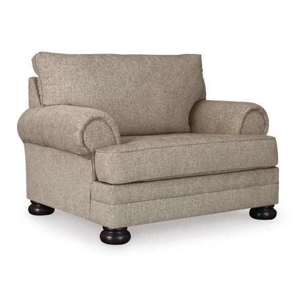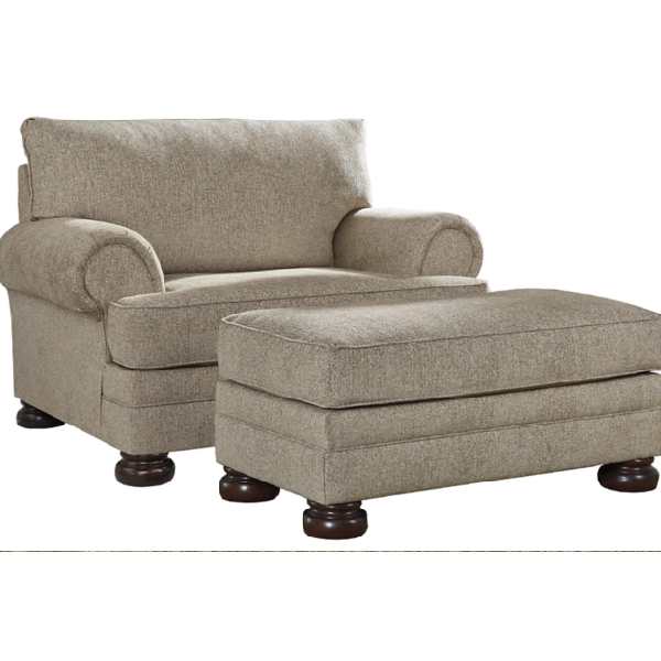 The Kananwood Chair and Ottoman set brings a touch of timeless elegance without compromising on comfort. Designed with a sumptuously oversized frame, this set exudes a richly traditional charm. The flared effect on the classic roll arms creates a more relaxed and inviting feel, while the plush chenille upholstery in a warm oatmeal tone adds an element of earthy sophistication. Distinctively turned bun feet in a dark finish complete the look, giving the set a substantial and stylish presence.