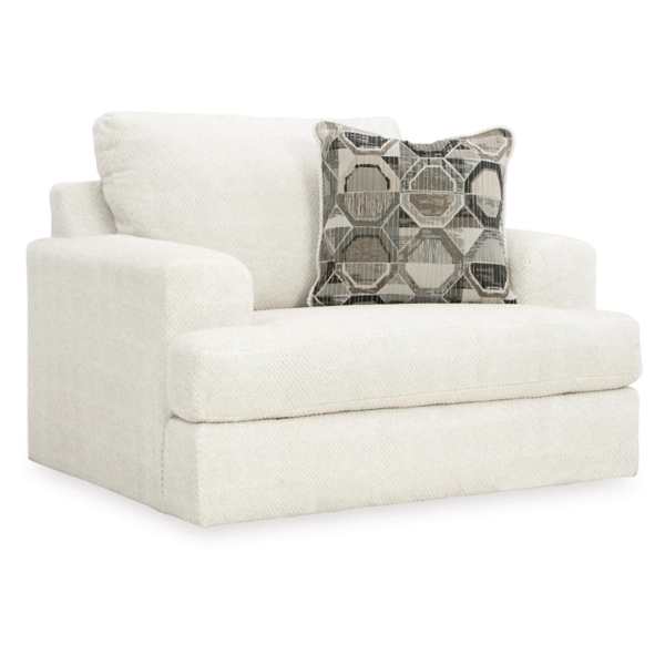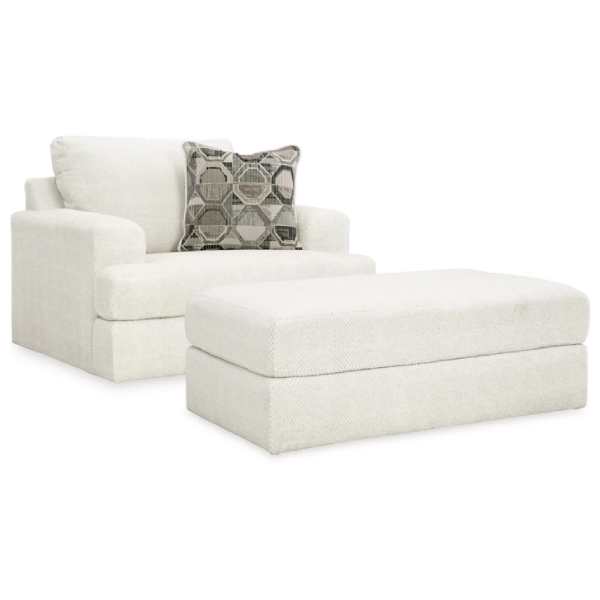 The Karinne Chair and Ottoman set offers a perfect blend of casual sophistication and modern comfort. With a contemporary frame and generously sized cushions, this set provides a cozy retreat in a soft neutral fabric that effortlessly brightens any space. Solid and geometric accent pillows enhance the chic-meets-cozy aesthetic, adding a stylish touch.