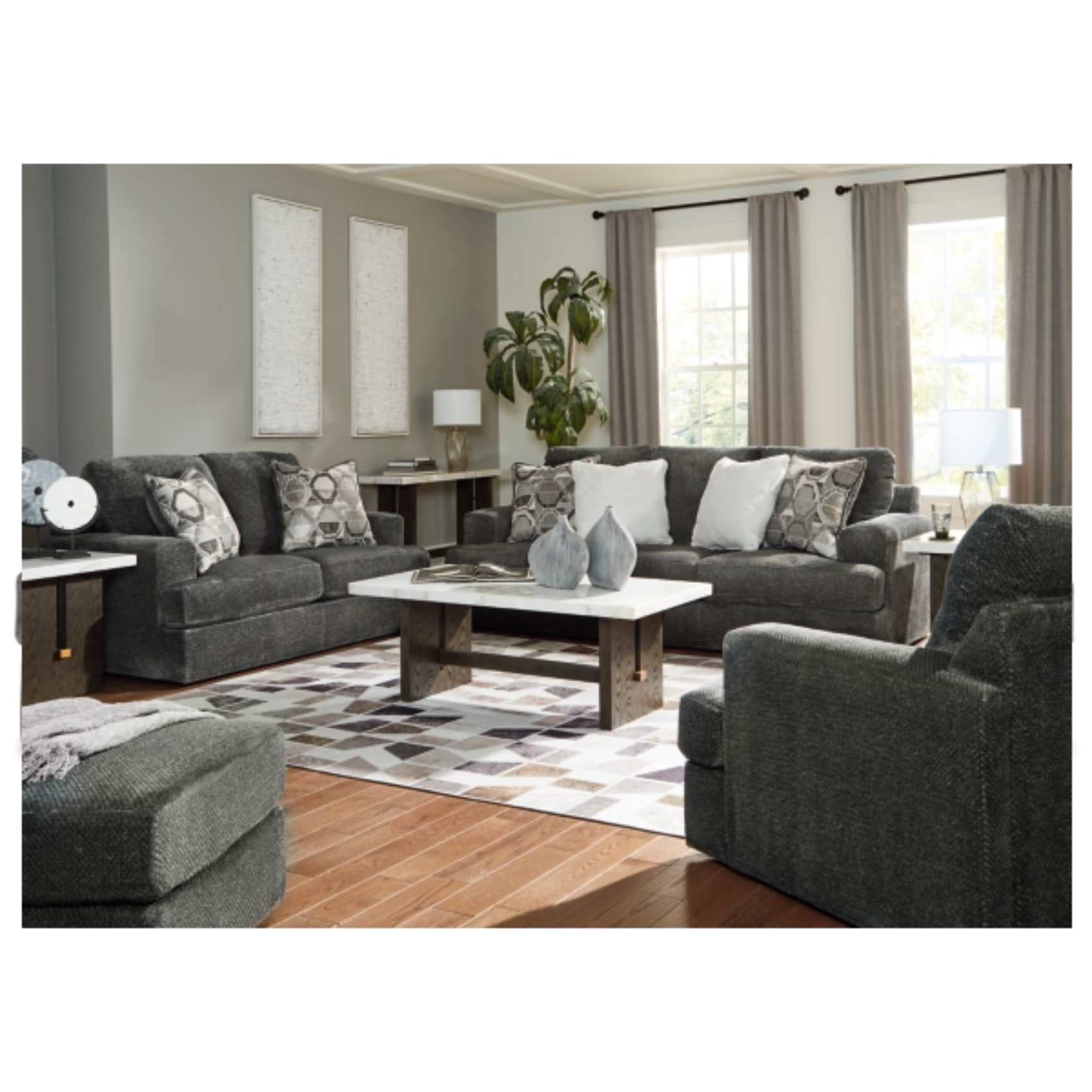 The Karinne Sofa, Loveseat, Chair, and Ottoman set (SKU - PKG015014) exemplifies contemporary design combined with exceptional comfort. Its sleek frame supports generously padded cushions upholstered in an ultra-soft neutral hue, creating a welcoming atmosphere in your living space. The inclusion of solid and geometric accent pillows enhances the chic-meets-cozy aesthetic, adding depth and texture to the overall look.