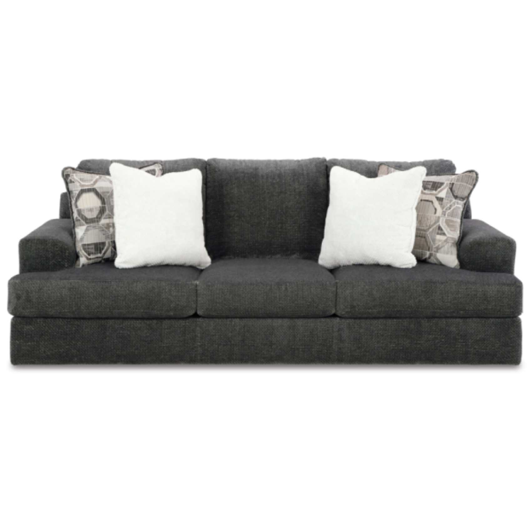 The Karinne Sofa, Loveseat, Chair, and Ottoman set (SKU - PKG015014) features a contemporary frame with ultra-soft neutral cushions, enhancing your living room's mood with simple style and everyday comfort. Solid and geometric accent pillows add to the chic-meets-cozy vibe. This versatile set complements various interior décors, making it a valuable addition to any home.