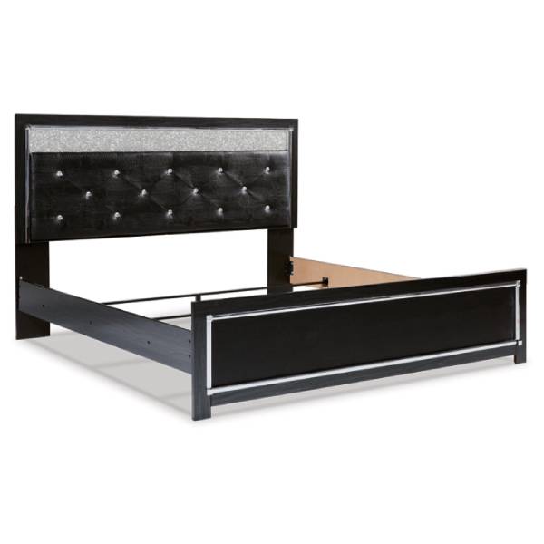 The Kaydell King Upholstered Panel Bed is the epitome of luxurious design, offering a perfect blend of old Hollywood glam with a contemporary edge. Crafted with intricate details and sophisticated accents, this king bed elevates any bedroom into a chic and indulgent sanctuary. The deep, dark finish, complemented by chrome-tone faceted accents, creates a striking visual appeal, while the textured black faux alligator panels on the headboard and footboard add an element of refined texture and luxury.