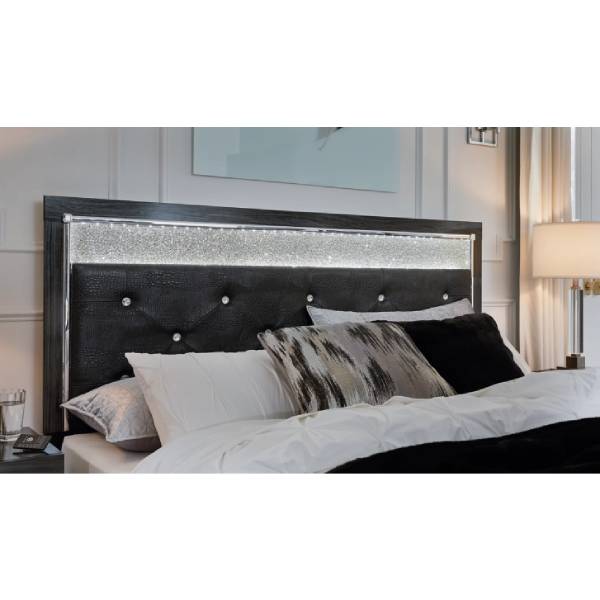 The Kaydell King/California King Upholstered Panel Headboard brings the lavish elegance of Hollywood-inspired glamour into your bedroom. Designed to captivate, this headboard features a striking deep black finish, enhanced by faceted chrome-tone accents and textured black faux alligator panels that add an air of sophistication. A sleek and contemporary aesthetic is elevated with luxurious black polyester upholstery, detailed with faux crystal button tufting and glitter accents, creating an indulgent and upscale look.