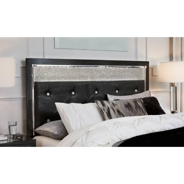 The Kaydell Queen Upholstered Panel Headboard is the perfect statement piece for those who crave a touch of Hollywood glamour in their bedroom. Designed with a sleek and sophisticated aesthetic, this headboard features a deep black finish, accented with faceted chrome-tone details and textured faux alligator panels, delivering an upscale and contemporary look. The black polyester upholstery is adorned with padded windowpane stitching and faux crystal button tufting, creating an indulgent, on-trend appeal that enhances any modern space.