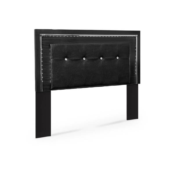 The Kaydell Queen Upholstered Panel Headboard brings a bold, sophisticated touch to your bedroom, combining modern design with Hollywood-inspired glamour. Its deep, rich finish is complemented by a replicated walnut wood grain, adding depth and texture to the sleek black frame. Chrome-tone faceted accents enhance its luxurious aesthetic, while the black polyester upholstery with faux crystal button tufting introduces an element of opulence. The padded windowpane stitching provides a plush, tailored look that’s both stylish and comfortable.