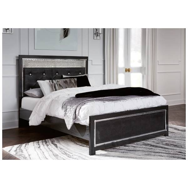 The Kaydell Queen Upholstered Panel Platform Bed is the embodiment of luxury, offering a sophisticated and contemporary take on old Hollywood glamour. With its deep, dark finish and faceted chrome-tone accents, this platform bed exudes a high-fashion, Hollywood-chic appeal. The sleek black upholstery features padded windowpane stitching that adds texture and richness, infusing the bed with an upscale, indulgent aesthetic. Faux crystal button tufting and glitter details complete the look, bringing a touch of sparkle to your bedroom.