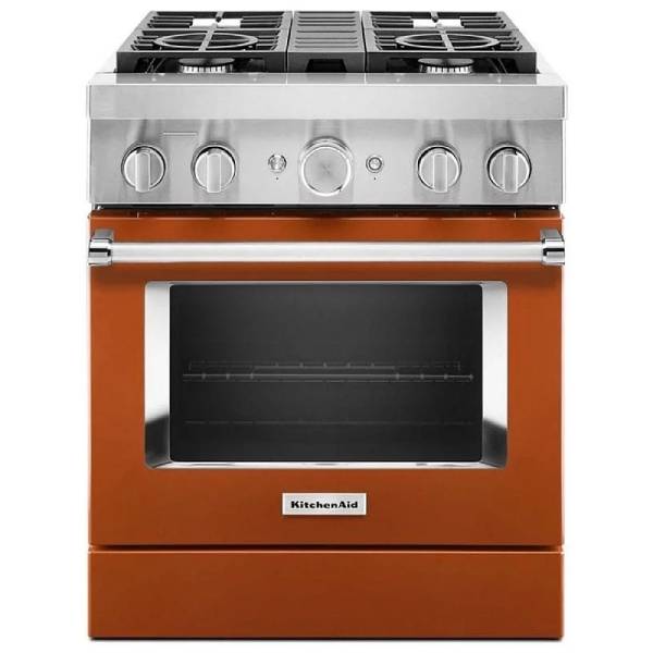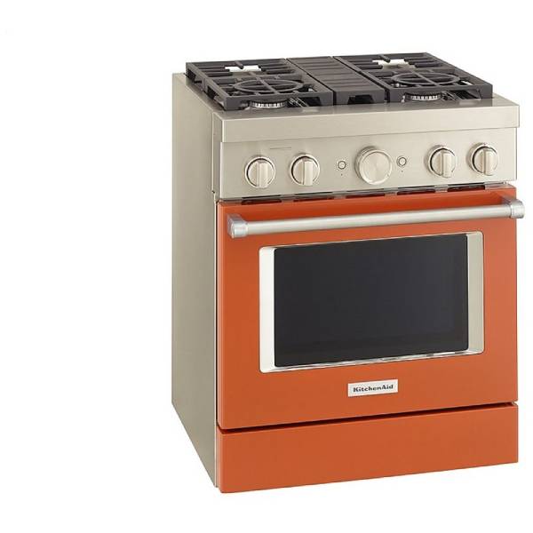 KitchenAid KFDC500JSC Dual Fuel Range, 30 inch Exterior Width, Self Clean, Convection, 4 Burners, 4.1 cu. ft. Capacity, 1 Ovens, Scorched Orange colour True European Convection, Telescopic Gliding Extension Rack, Temperature Probe