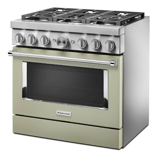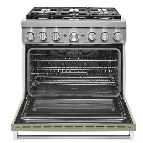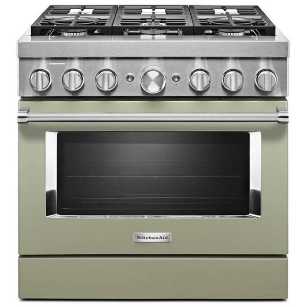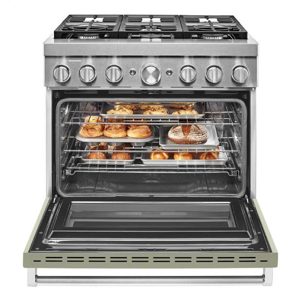 KitchenAid KFDC506JAV Dual Fuel Range, 36 inch Exterior Width, Self Clean, Convection, 6 Burners, 5.1 cu. ft. Capacity, 1 Ovens, Avocado Cream colour True European Convection, Telescopic Gliding Extension Rack