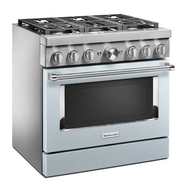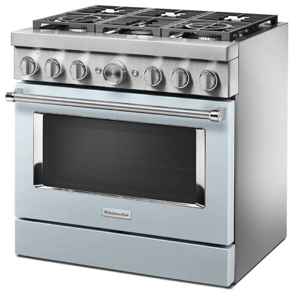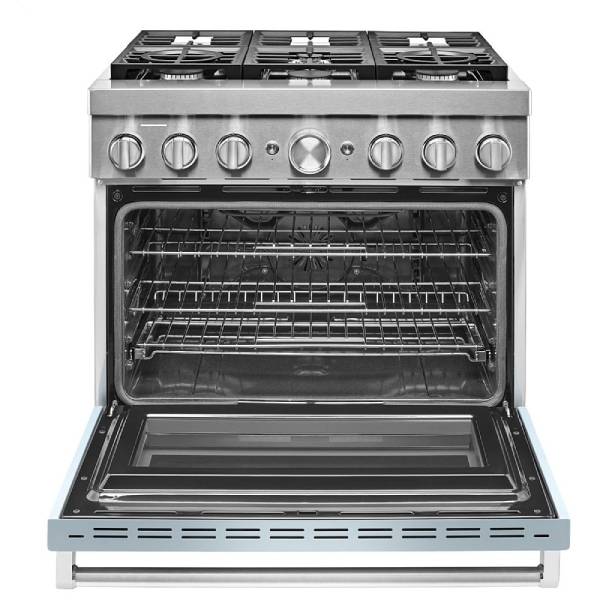 KitchenAid KFDC506JMB Dual Fuel Range, 36 inch Exterior Width, Self Clean, Convection, 6 Burners, 5.1 cu. ft. Capacity, 1 Ovens, Misty Blue colour True European Convection, Telescopic Gliding Extension Rack