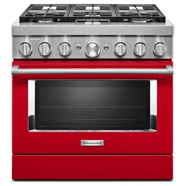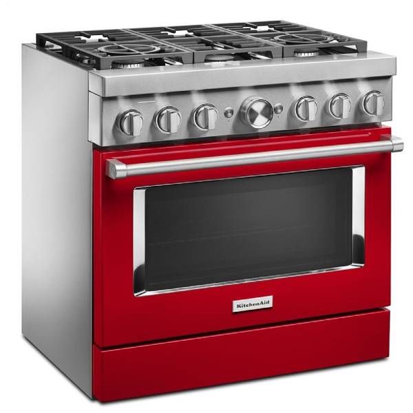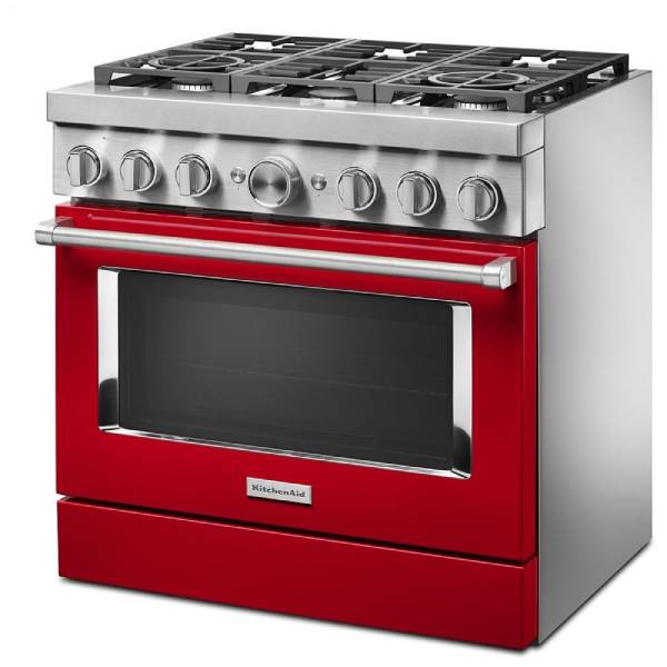 KitchenAid KFDC506JPA Dual Fuel Range, 36 inch Exterior Width, Self Clean, Convection, 6 Burners, 5.1 cu. ft. Capacity, 1 Ovens, Passion Red colour True European Convection, Telescopic Gliding Extension Rack