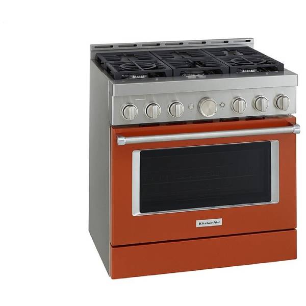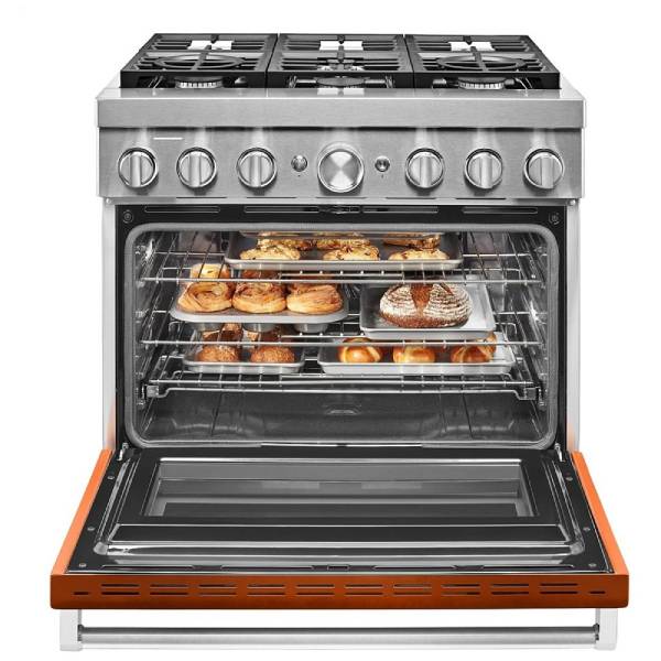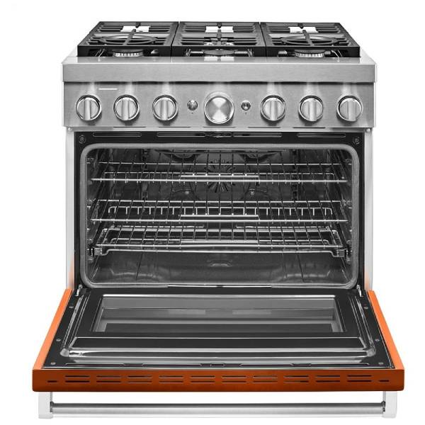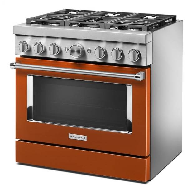KitchenAid KFDC506JSC Dual Fuel Range, 36 inch Exterior Width, Self Clean, Convection, 6 Burners, 5.1 cu. ft. Capacity, 1 Ovens, Scorched Orange colour True European Convection, Telescopic Gliding Extension Rack