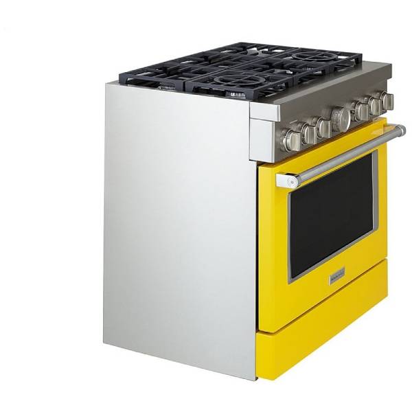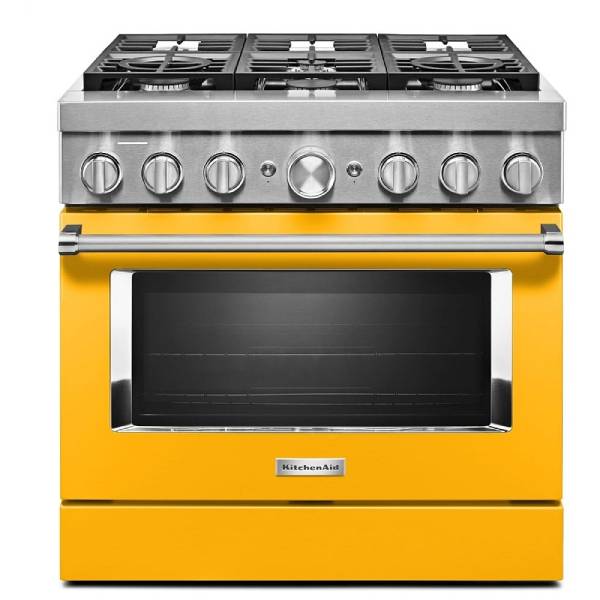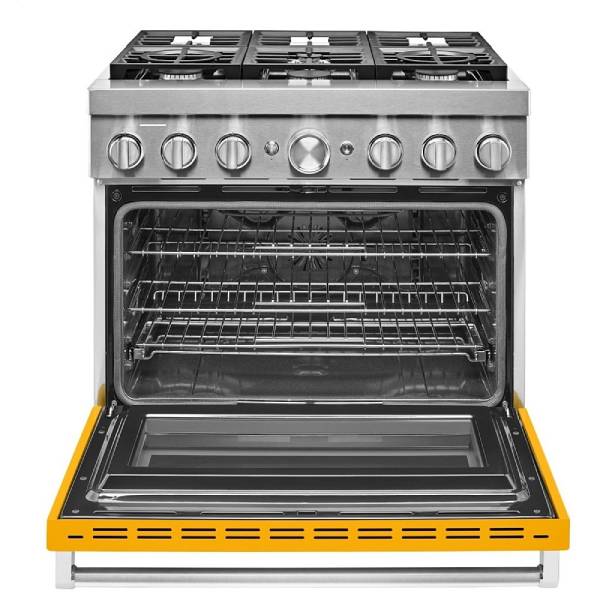 KitchenAid KFDC506JYP Dual Fuel Range, 36 inch Exterior Width, Self Clean, Convection, 6 Burners, 5.1 cu. ft. Capacity, 1 Ovens, Yellow Pepper colour True European Convection, Telescopic Gliding Extension Rack