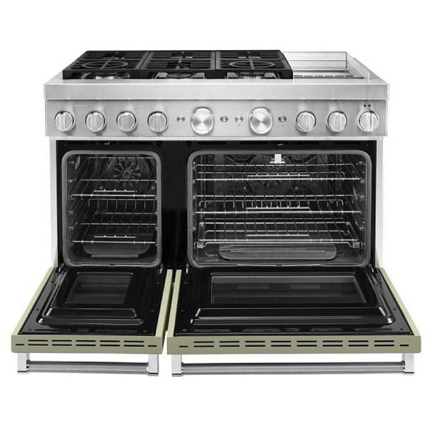 KitchenAid KFDC558JAV Dual Fuel Range, 48 inch Exterior Width, Self Clean, Convection, 6 Burners, 6.3 cu. ft. Capacity, 2 Ovens, Avocado Cream colour True European Convection, Griddle, Telescopic Gliding Extension Rack, Temperature Probe