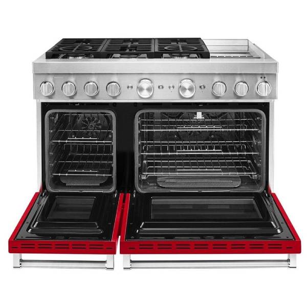 KitchenAid KFDC558JSC Dual Fuel Range, 48 inch Exterior Width, Self Clean, Convection, 6 Burners, 6.3 cu. ft. Capacity, 2 Ovens, Scorched Orange colour True European Convection, Griddle, Telescopic Gliding Extension Rack, Temperature Probe