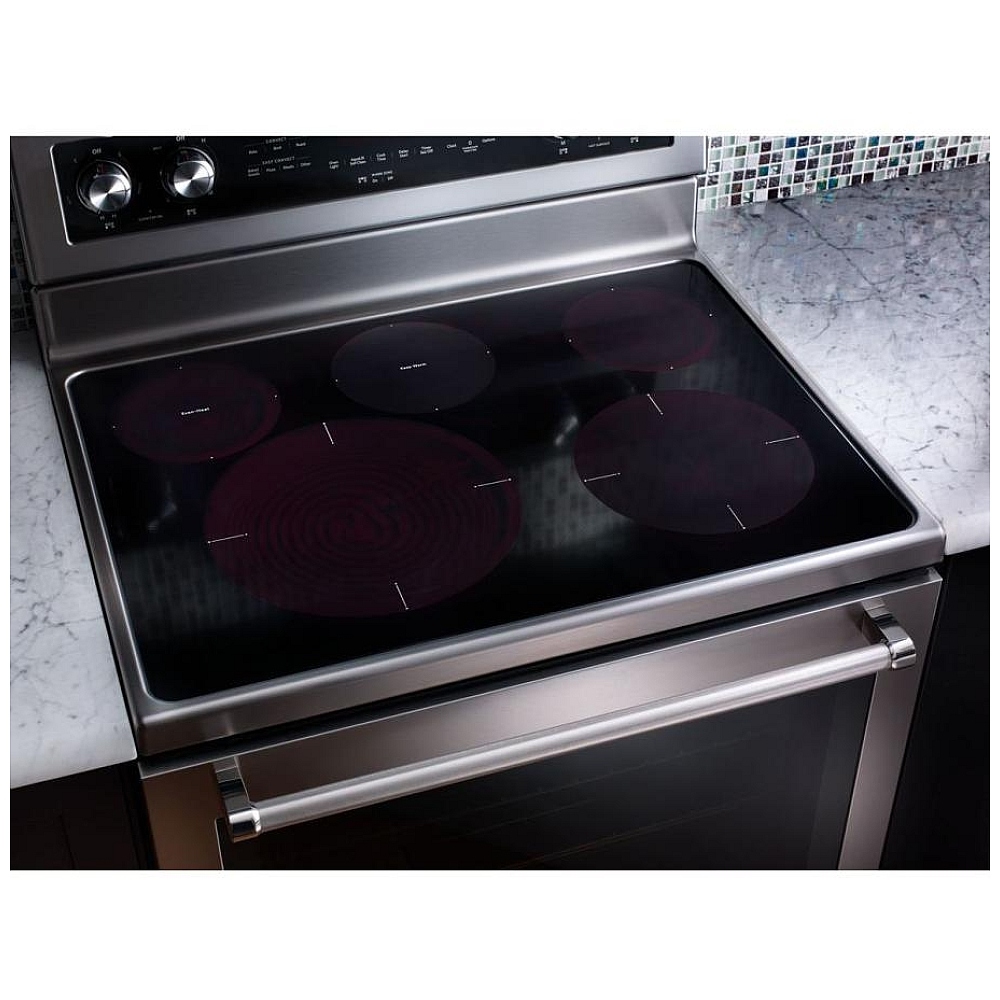 The KitchenAid YKFEG500ESS also features an intuitive glass touch control panel, making it easy to program and adjust settings with a simple tap. The sleek black ceramic glass cooktop not only adds a refined look to your kitchen but also offers five heating elements, including a 100-Watt warming zone, giving you the flexibility and precision needed to master any cooking technique.
