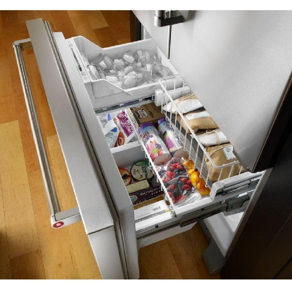 The bottom freezer drawer features a large 5.59 cubic foot capacity with a tri-level design, providing organized storage for your frozen items. Illuminated by bright LED lighting, both the refrigerator and freezer compartments offer excellent visibility, making it easy to locate items.