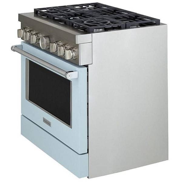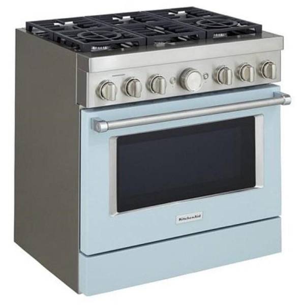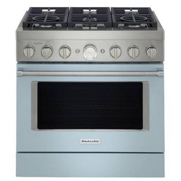 KitchenAid KFGC506JMB Gas Range, 36 inch Exterior Width, Self Clean, Convection, 6 Burners, 5.1 cu. ft. Capacity, 1 Ovens, Misty Blue colour True European Convection, Telescopic Gliding Extension Rack, Temperature Probe
