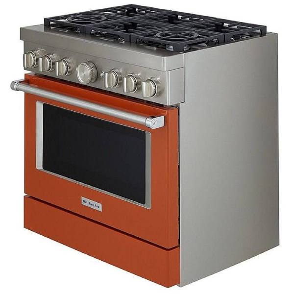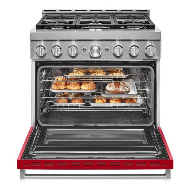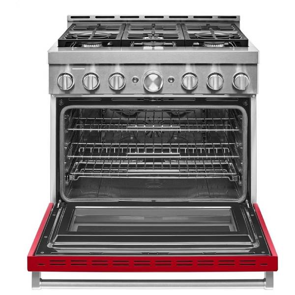 KitchenAid KFGC506JPA Gas Range, 36 inch Exterior Width, Self Clean, Convection, 6 Burners, 5.1 cu. ft. Capacity, 1 Ovens, Passion Red colour True European Convection, Telescopic Gliding Extension Rack, Temperature Probe