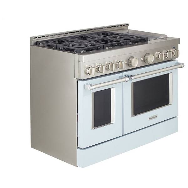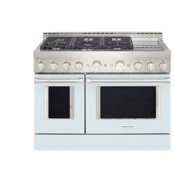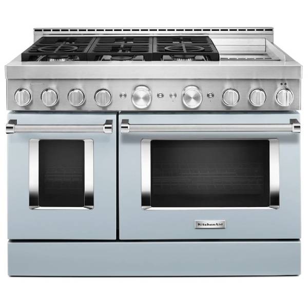 KitchenAid KFGC558JMB Gas Range, 48 inch Exterior Width, Self Clean, Convection, 6 Burners, 6.3 cu. ft. Capacity, 2 Ovens, Misty Blue colour True European Convection, Griddle, Telescopic Gliding Extension Rack, Temperature Probe