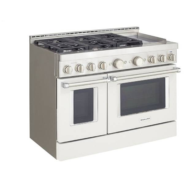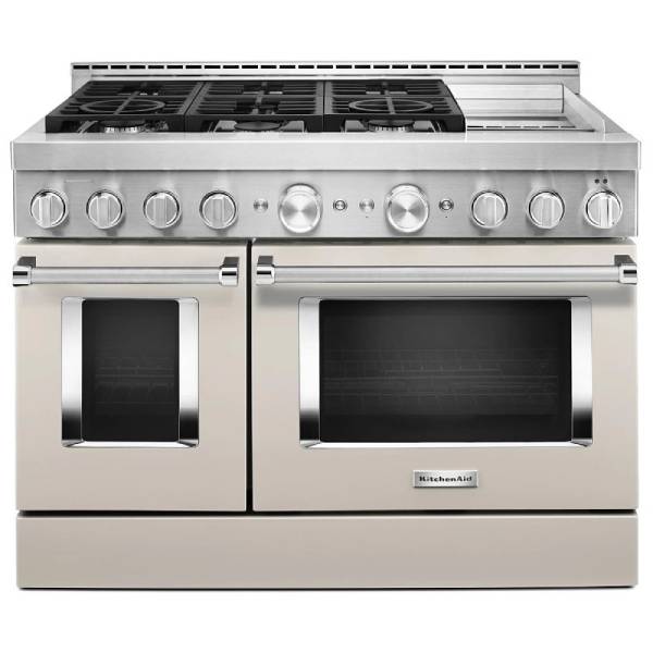 KitchenAid KFGC558JMH Gas Range, 48 inch Exterior Width, Self Clean, Convection, 6 Burners, 6.3 cu. ft. Capacity, 2 Ovens, Milk Shake colour True European Convection, Griddle, Telescopic Gliding Extension Rack, Temperature Probe