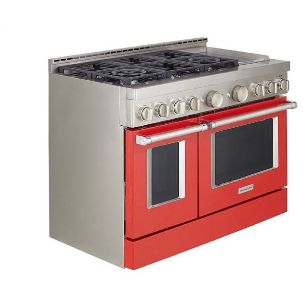 KitchenAid KFGC558JPA Gas Range, 48 inch Exterior Width, Self Clean, Convection, 6 Burners, 6.3 cu. ft. Capacity, 2 Ovens, Passion Red colour True European Convection, Griddle, Telescopic Gliding Extension Rack, Temperature Probe