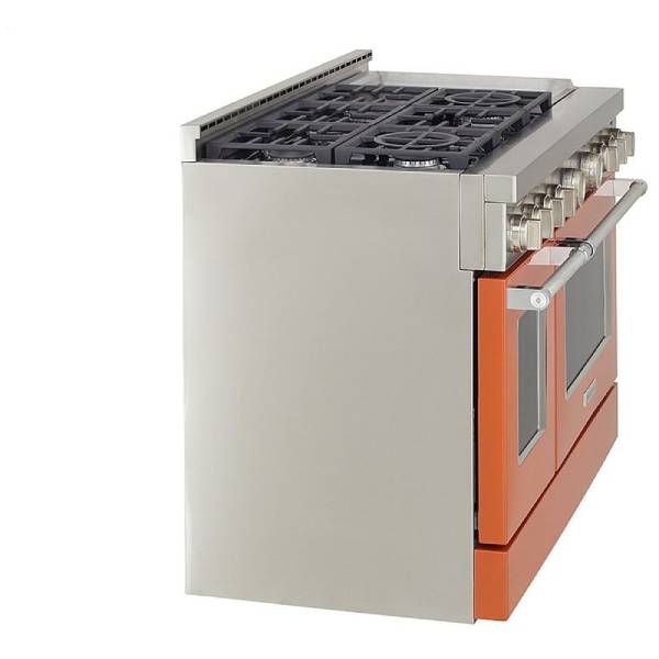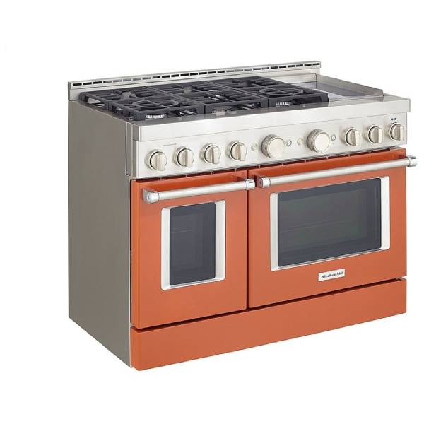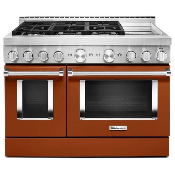 KitchenAid KFGC558JSC Gas Range, 48 inch Exterior Width, Self Clean, Convection, 6 Burners, 6.3 cu. ft. Capacity, 2 Ovens, Scorched Orange colour True European Convection, Griddle, Telescopic Gliding Extension Rack, Temperature Probe