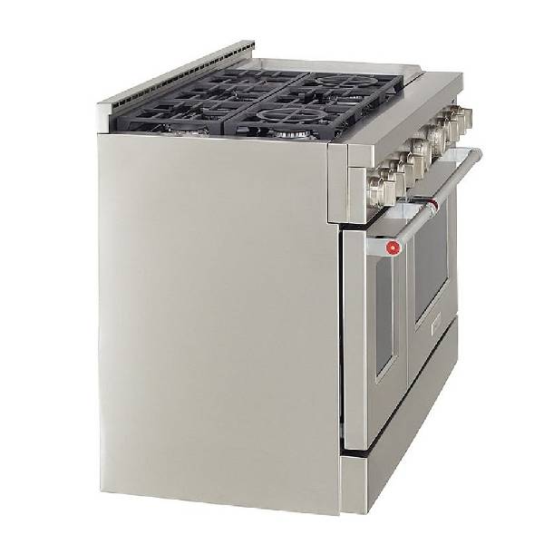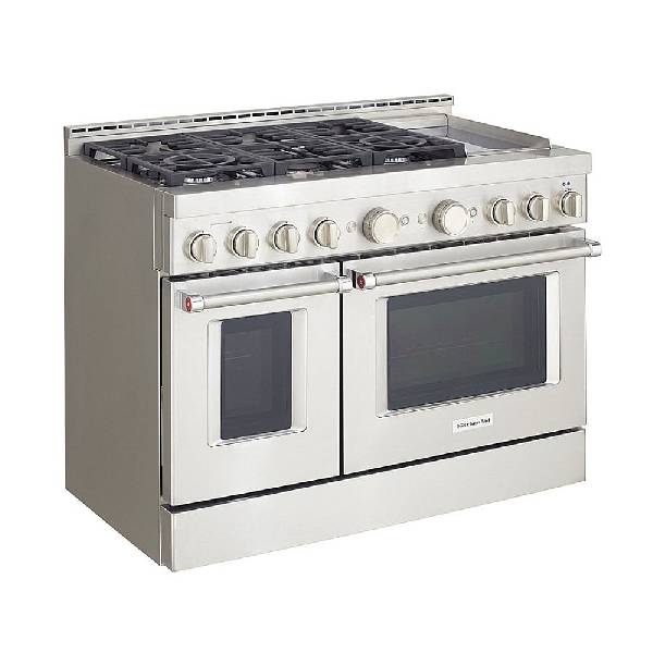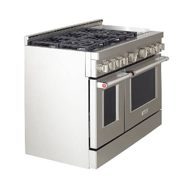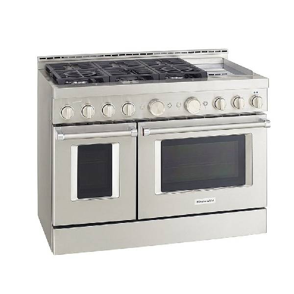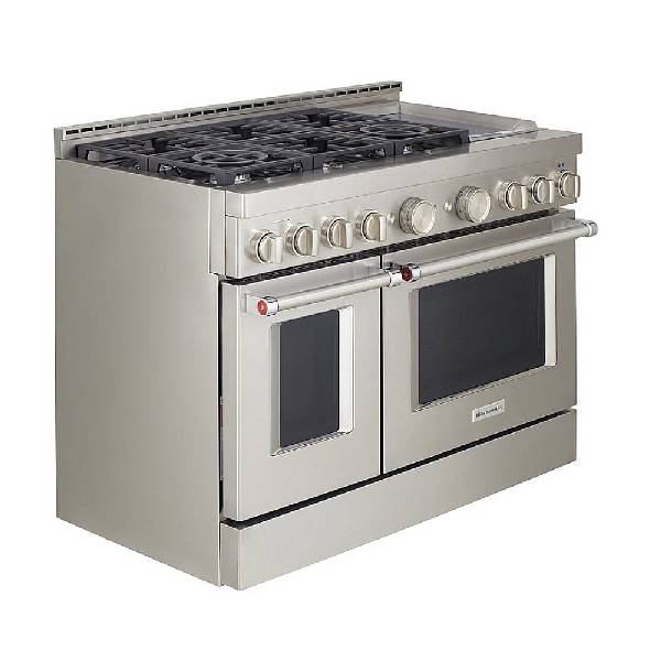 KitchenAid KFGC558JSS Gas Range, 48 inch Exterior Width, Self Clean, Convection, 6 Burners, 6.3 cu. ft. Capacity, 2 Ovens, Stainless Steel colour True European Convection, Griddle, Telescopic Gliding Extension Rack, Temperature Probe