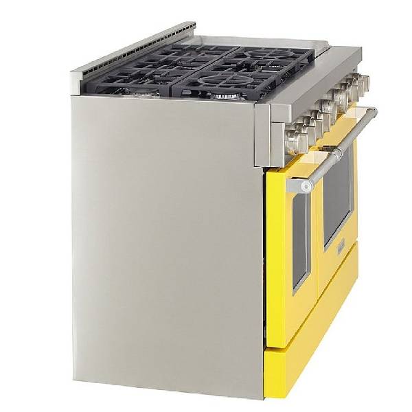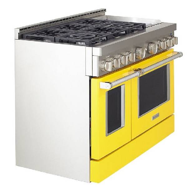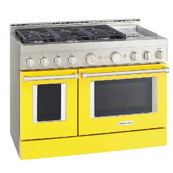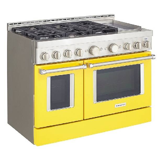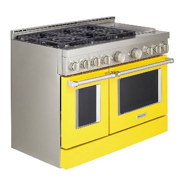 KitchenAid KFGC558JYP Gas Range, 48 inch Exterior Width, Self Clean, Convection, 6 Burners, 6.3 cu. ft. Capacity, 2 Ovens, Yellow Pepper colour True European Convection, Griddle, Telescopic Gliding Extension Rack, Temperature Probe