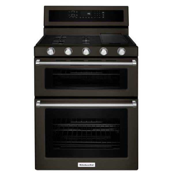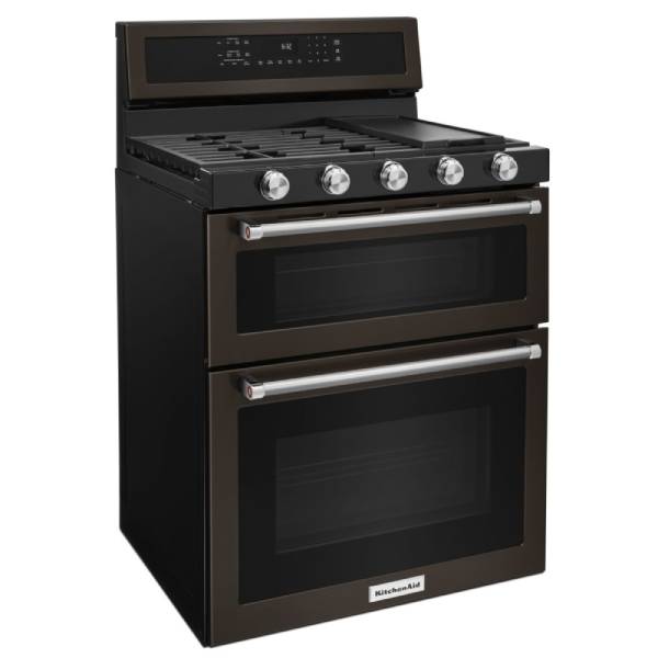 Elevate your culinary endeavors with the KitchenAid KFGD500EBS Gas Range, a stunning 30-inch double oven range that combines exceptional performance with an elegant black stainless steel finish. Designed for serious cooks, this gas range features Even-Heat™ True Convection, which employs a unique bow-tie design and a convection fan to ensure uniform heating throughout the oven. With a combined capacity of 6.0 cu. ft., this appliance allows you to prepare multiple dishes simultaneously, making it perfect for entertaining or family meals. The cooktop boasts five powerful burners ranging from 5,000 to 17,000 BTUs, providing the versatility to achieve everything from a rapid boil to a gentle simmer.