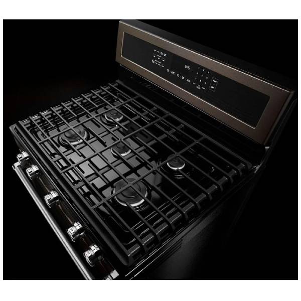 The KitchenAid KFGG500EBS Gas Range is a perfect blend of style, innovation, and performance, designed to elevate your culinary experience. With a 30-inch exterior width and a sleek black stainless steel finish, this freestanding range fits seamlessly into any modern kitchen. The 5.8 cu. ft. oven capacity provides ample space to cook multiple dishes simultaneously, while the Even-Heat™ True Convection system ensures consistent, flawless results every time. Its unique bow-tie design paired with a convection fan circulates heat evenly, ensuring your meals are cooked to perfection, from crisp baked goods to well-browned roasts.