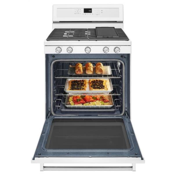 KitchenAid KFGG500EWH Gas Range, 30 inch Exterior Width, Self Clean, Convection, 5 Burners, 5.8 cu. ft. Capacity, Storage Drawer, 1 Ovens, White colour True European Convection