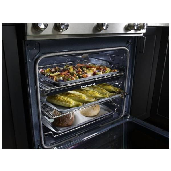 KitchenAid KSGB900ESS Gas Range, 30 inch Exterior Width, Self Clean, Convection, 5 Burners, 6.5 cu. ft. Capacity, Oven Drawer, 1 Ovens, Stainless Steel colour True European Convection, Telescopic Gliding Extension Rack, Steam Rack, Griddle
