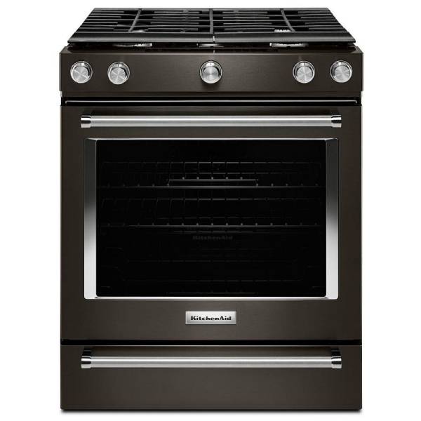 KitchenAid KSGG700EBS Gas Range, 30 inch Exterior Width, Self Clean, Convection, 5 Burners, 5.8 cu. ft. Capacity, Storage Drawer, 1 Ovens, Black Stainless Steel colour True European Convection, Steam Rack
