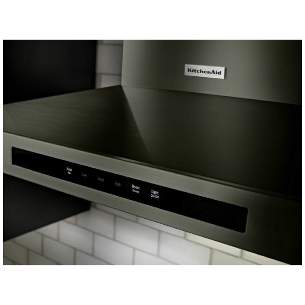 KitchenAid KVWB606HBS Range Hood, 36 inch Exterior Width, Chimney, Wall Mounted, 585 CFM, Accepts Both, LED, Dishwasher Safe Filters, Baffle Filter, Black Stainless Steel colour Blower Included