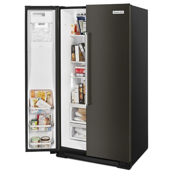 The KitchenAid 19.9 cu. ft. side-by-side refrigerator combines organization, style, and peak freshness to enhance your kitchen experience. Its sleek black stainless steel finish and counter-depth design instantly upgrade the look of any kitchen while ensuring your food stays fresh and delicious.