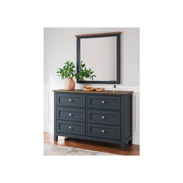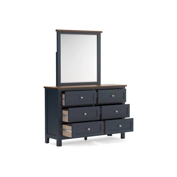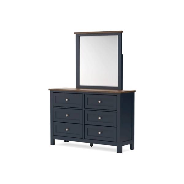Bring a touch of homespun charm and timeless style to your bedroom with the Landocken Dresser and Mirror set, available at Teletime. This beautifully crafted set blends traditional design with a modern twist, featuring a rich two-tone finish—dark slate blue paired with a warm light brown wood-tone top. The classic Shaker-inspired drawer fronts and tapered legs evoke a sense of simplicity and elegance, perfect for creating a cozy and welcoming atmosphere.
