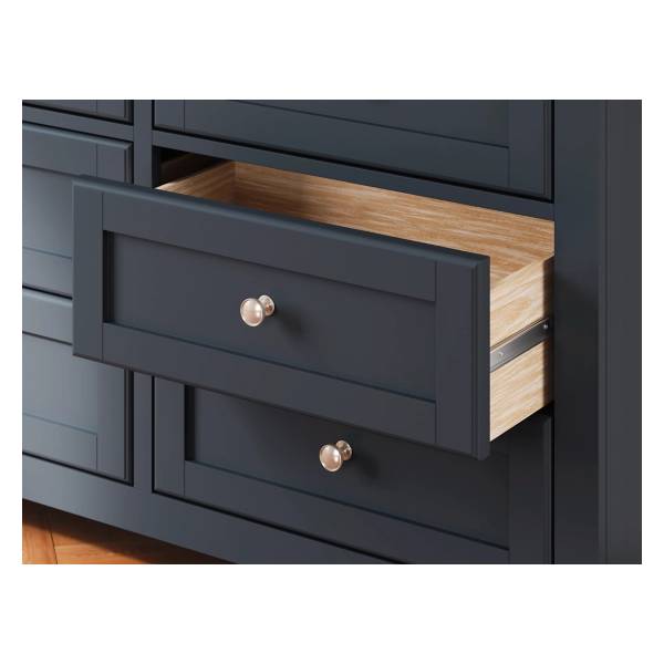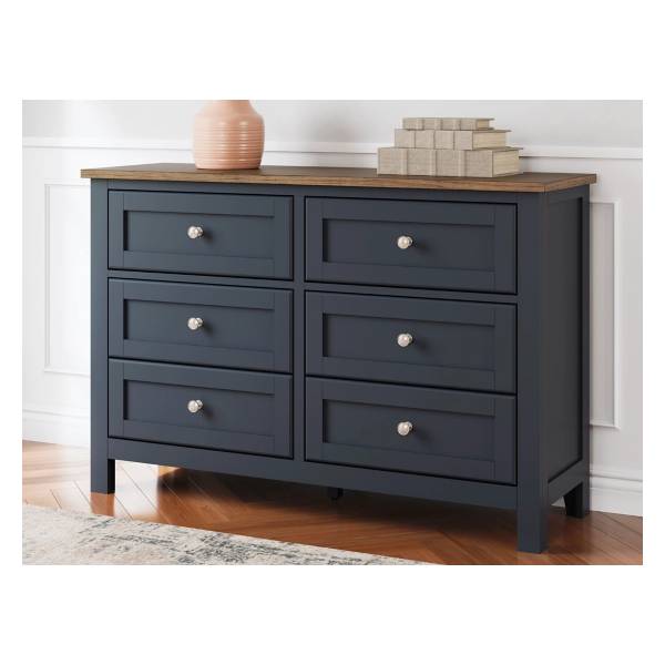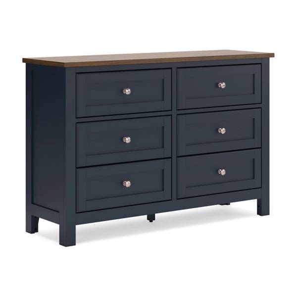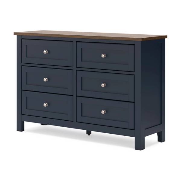 The Landocken Dresser is a perfect blend of modern charm and timeless style, making it a stunning addition to any bedroom. Featuring a two-tone design, the dresser combines a dark slate blue finish with a light brown wood-tone top, creating a captivating contrast that brings warmth and character to your space. Its classic Shaker-style drawer fronts and legs add a touch of simplicity and sophistication, elevating the overall aesthetic of your bedroom or guest suite.