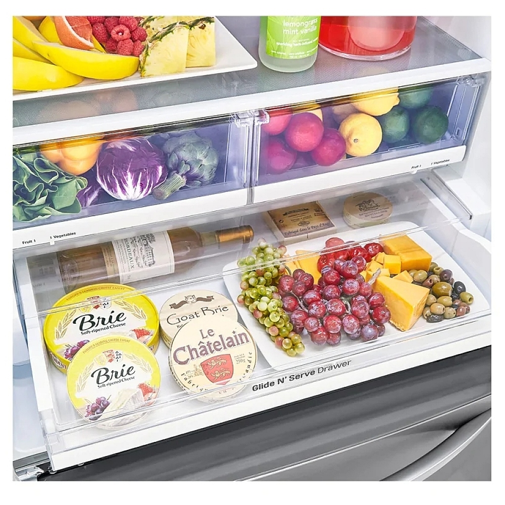 French door-style refrigerators like the LG LRFNS2503V offer numerous conveniences, including efficient organization, visibility, and additional features like cool drawers and slide-out shelves for easier access to your food items.