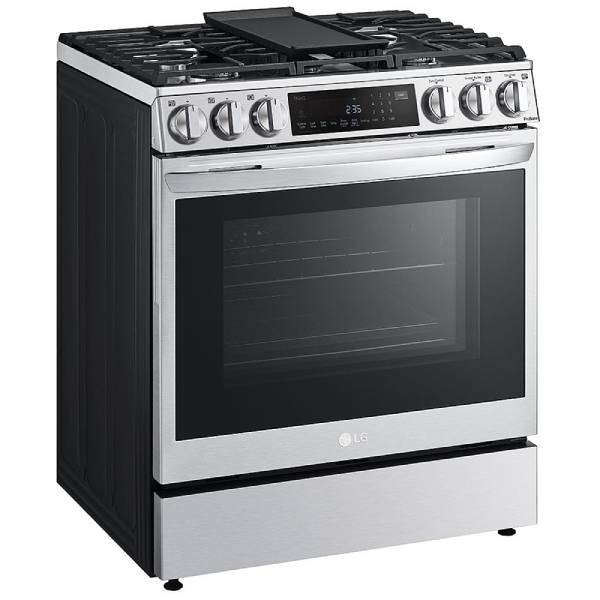 Overview The LG LSGL6335F freestanding gas range, featuring a sleek 30-inch exterior width and a smudge-proof stainless steel finish, combines style with functionality. Equipped with LG's advanced ProBake Convection technology, this range elevates your cooking experience. The Perfect Bake element allows for precise temperature adjustments for your favorite recipes, ensuring perfect results without the need for preheating.