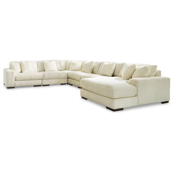 Create a stylish and inviting living space with the Lindyn 6-Piece Sectional with Chaise, a masterpiece of modern design and plush comfort. Upholstered in luxuriously soft corded fabric in a refined ivory hue, this sectional blends seamlessly with contemporary interiors while adding a touch of understated elegance. Designed for relaxation, it offers an expansive seating area that is perfect for entertaining guests or unwinding with family.