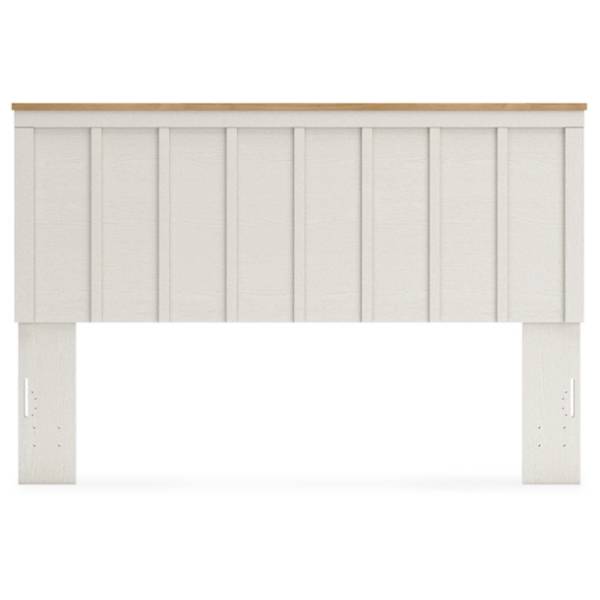 Crafted from a combination of engineered wood, including MDF, particleboard, and plywood, this headboard provides a durable foundation without compromising on affordability. The body of the headboard is finished in a crisp white hue, while the replicated oak grain top adds an authentic, rustic charm, ensuring a natural look that complements a wide range of interiors. The decorative laminate used throughout the design mimics natural wood textures, offering consistency in color, pattern, and texture.