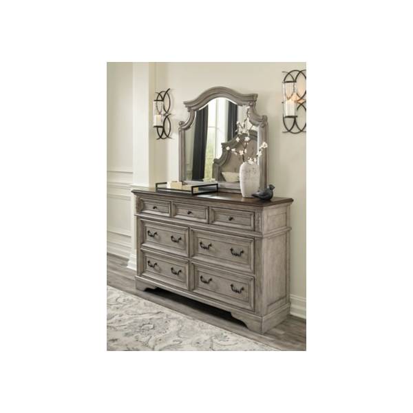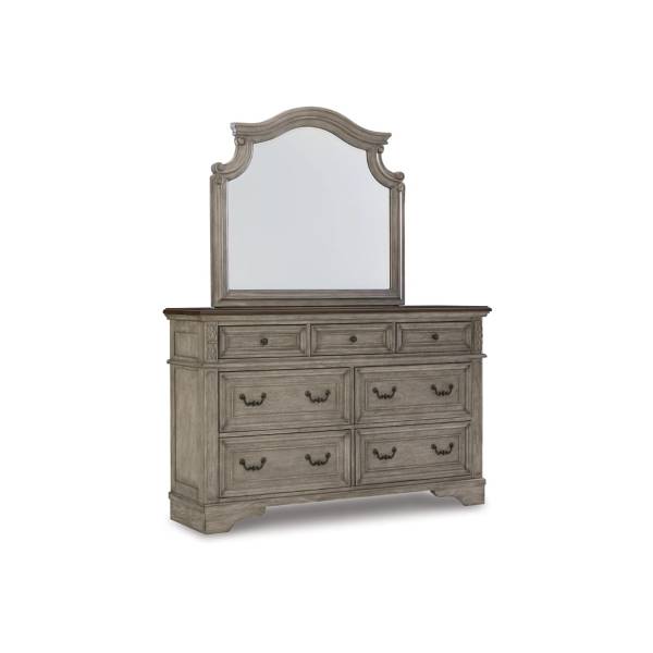Bring timeless cottage charm into your bedroom with the beautifully designed Lodenbay Dresser and Mirror, available at Teletime. This exquisite set blends classic elegance with rustic warmth, showcasing a two-tone finish that pairs an antiqued gray body with a deep walnut brown top for a rich and inviting look. Ornate detailing and framed drawer fronts create a refined silhouette, while the gracefully shaped mirror adds a touch of traditional sophistication.