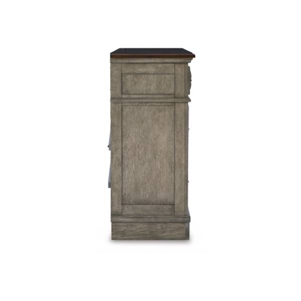 The Lodenbay Dresser, exclusively at Teletime, captures the essence of cottage-inspired charm with a refined touch of elegance. Its two-tone finish, featuring an antiqued gray body and a rich walnut brown top, evokes warmth and rustic sophistication, making it a standout piece in any bedroom setting. The framed drawer fronts and dark bronze-tone hardware beautifully blend classic detailing with a cozy, homey appeal.