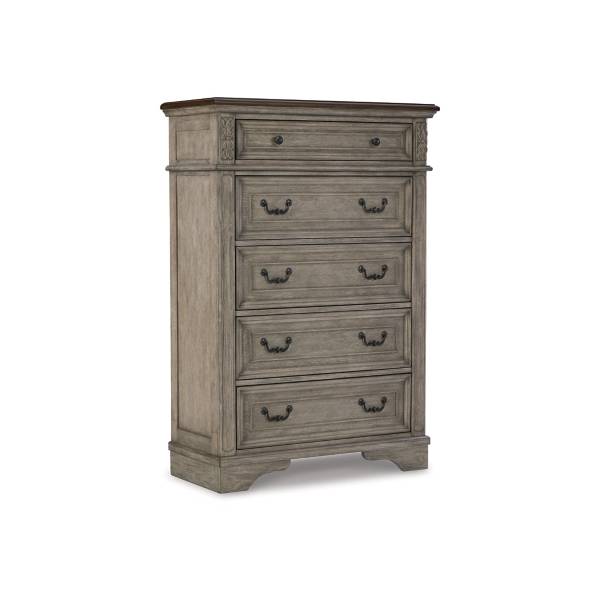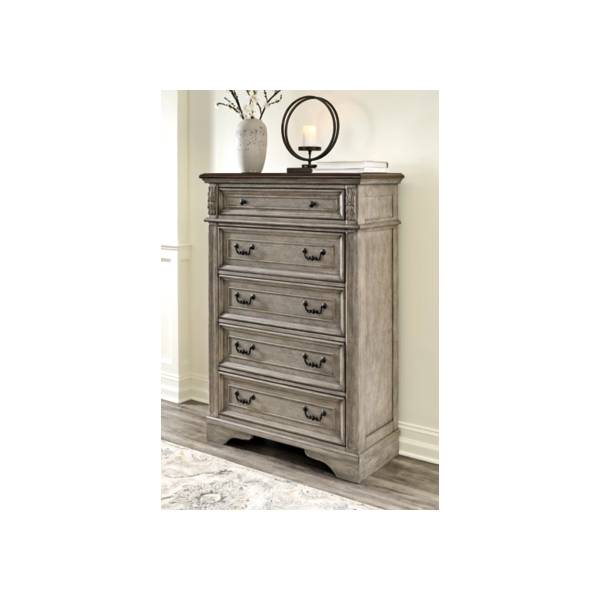 The Lodenbay Five Drawer Chest effortlessly combines rustic charm with elegant craftsmanship, creating the ideal storage solution for any bedroom. Its two-tone finish features an antiqued gray body paired with a rich, deep walnut top, giving it a timeless appeal that enhances your space with warmth and character. The framed drawer fronts, complemented by overlay decorative corbels, further elevate its sophisticated yet homey design.