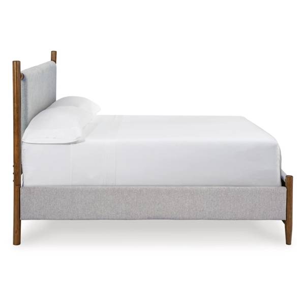 Introducing the Lyncott King Upholstered Bed, a piece that effortlessly merges modern sophistication with timeless appeal, making it a perfect addition to both contemporary and mid-century inspired interiors. This bed features a sleek, upholstered panel headboard and footboard, crafted with luxurious polyester upholstery that adds a touch of softness and comfort to your bedroom. The sling-style cushioned headboard provides gentle support, ensuring a relaxing and serene atmosphere for restful nights.
