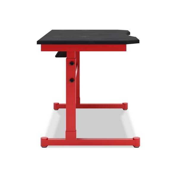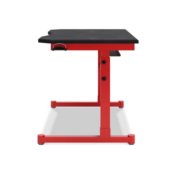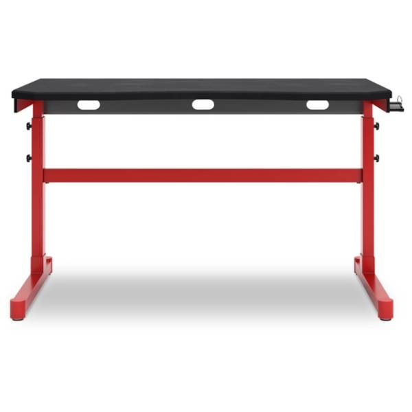 An adjustable height home office desk with a mouse pad surface, headset hanger, and cord management. Features three height options, durable construction, and a sleek red metal frame.
