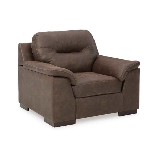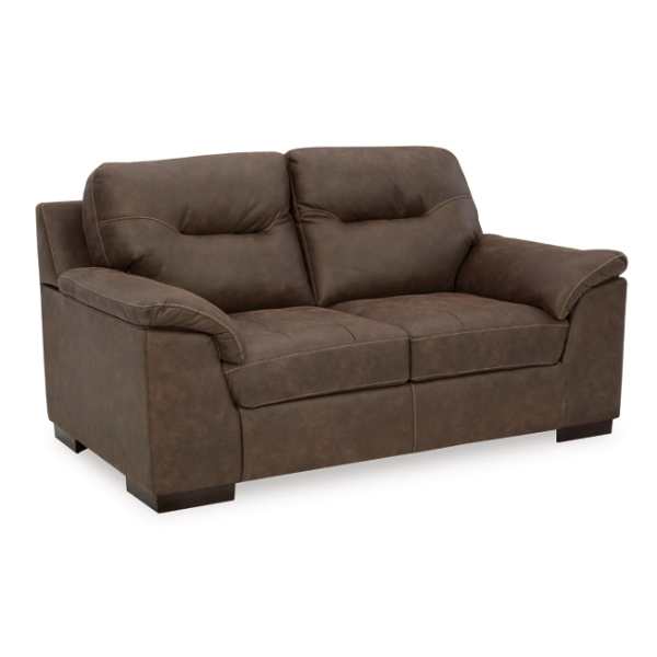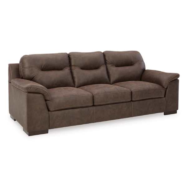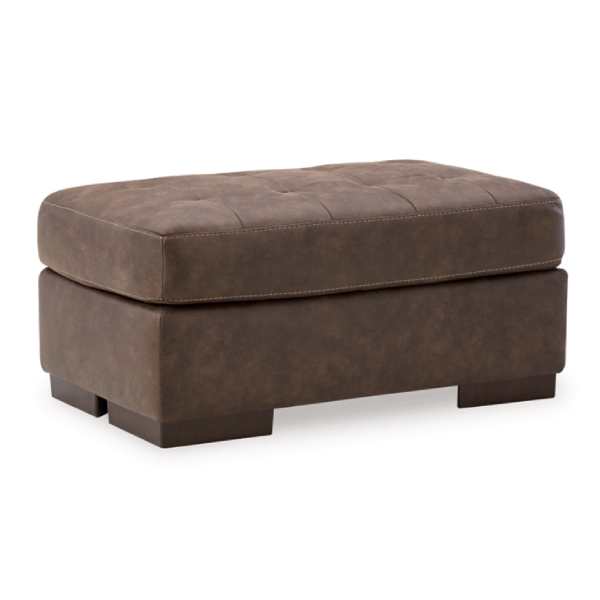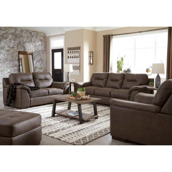 The Maderla Sofa, Loveseat, Chair, and Ottoman (SKU - PKG010995) set by Ashley Furniture combines contemporary design with everyday comfort. The walnut brown faux leather upholstery, along with jumbo stitching and tufted details, adds a touch of luxury to your living space. The set is designed for relaxation, featuring supportive cushions and flared pillow top armrests. Crafted with durable materials, this collection ensures longevity and lasting support. Pricing varies by retailer, with some offering the set at approximately $1,849.99.
