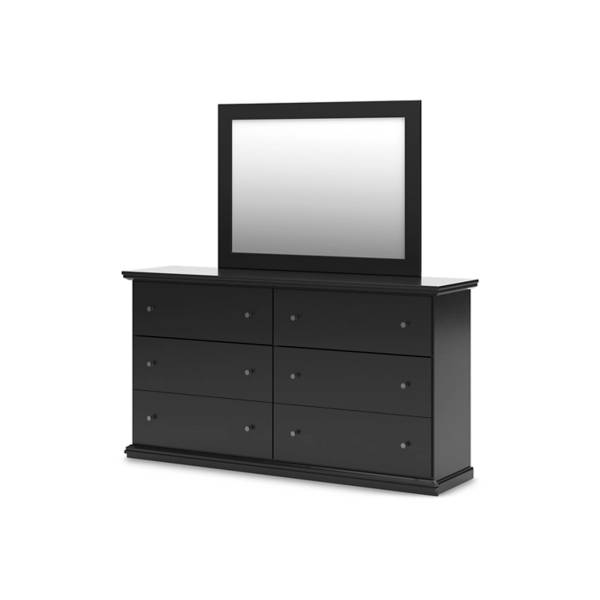 The Maribel Dresser and Mirror set from Teletime offers a striking blend of traditional charm and contemporary elegance, creating a timeless addition to any bedroom space. Finished in a rich black tone, this set exudes sophistication while maintaining a warm, inviting presence. The dresser features six spacious smooth-gliding drawers, ideal for organizing clothing and accessories, each adorned with refined sculpted knobs for a touch of understated elegance. The attached mirror complements the dresser perfectly, enhancing the room’s depth and brightness while completing the cohesive look. Crafted from engineered wood, the set offers a durable and affordable storage solution designed for everyday use. Classic moulding details and clean lines further elevate its versatile appeal, making it a seamless fit for both traditional and transitional interiors. Whether you're updating your master suite or furnishing a guest room, the Maribel dresser and mirror set delivers practical functionality with a refined design—exclusively at Teletime.
